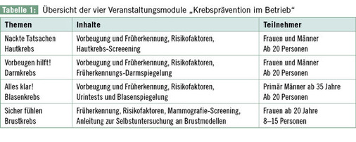 Das Gesamtangebot umfasst vier Informationsveranstaltungen zur Früherkennung von Brust-, Blasen-, Haut- und Darmkrebs, die in Form von wählbaren, einstündigen Modulen bei der Krebsgesellschaft NRW gebucht werden können ( Tabelle 1 ).