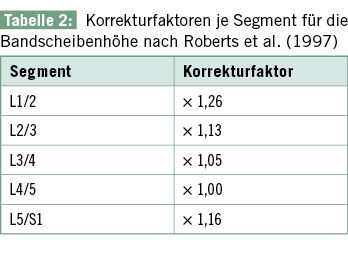 Bei der Chondrose ist zu berücksichtigen, dass physiologisch die Höhe der Bandscheiben von L1/2 bis L4/5 zunimmt, während die Bandscheibe L5/S1 wieder flacher ist (Shao et al. 2002). Maßgeblich für die Schweregradeinteilung der Chon-drosen ist die normierte relative Bandscheibenhöhe, die mittels der Korrekturfaktoren nach Roberts et al. (1997) berechnet wird ( Tabelle 2 ).