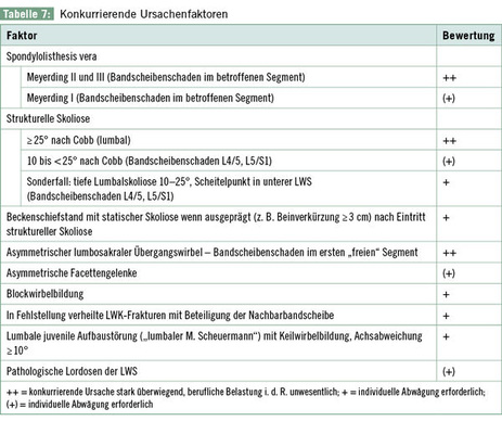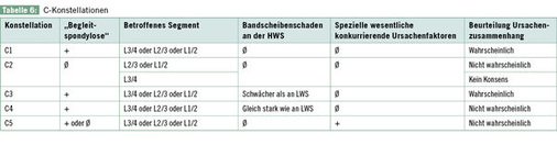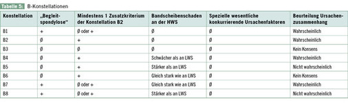 B-Konstellationen sind häufig. Die Konstellationen, bei denen ein Ursachenzusammenhang im Konsens als wahrscheinlich beurteilt wurde, haben gemeinsam, dass ent-weder eine „Begleitspondylose“ nach Definition der Konsensempfehlungen vorliegt oder mindestens 1 der Zusatzkriterien der Konstellation B 2 erfüllt ist ( Tabelle 4 ).