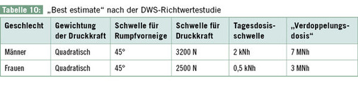 Ziel der Richtwertestudie (Seidler et al. 2013a,b) war es, im Rahmen einer Nachauswertung der Daten der DWS ein Dosismodell unter Berücksichtigung geeigneter Schwellenwerte abzuleiten. Das von den Autoren abgeleitete „best estimate“ ist in Tabelle 10 zusammengefasst.
