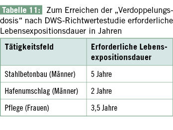 In Tätigkeitsfeldern, die im Konsens als risikobehaftet angesehen werden, würden die in der DWS-Richtwertestudie abgeleiteten „Verdoppelungsdosen“ bereits inner-halb weniger Jahre erreicht. Dies soll anhand von Tätigkeitsfeldern im Stahlbetonbau, im klassischen Hafenumschlag und in der Pflege illustriert werden, für die die für die Abschätzung erforderlichen Expositionsdaten von Jäger et al. (1999) publiziert wurden ( Tabelle 11 ). Die in der Legaldefinition der BK 2108 geforderte Langjährigkeit der Einwirkung wäre hier nicht mehr gegeben.