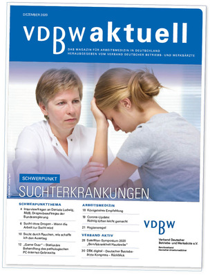 Nach den Schwerpunktthemen Sicher Mobil im Verkehr, Impfen sowie Stress – Arbeit 4.0 – Digitalisierung widmet sich der Verband Deutscher Betriebs- und Werksärzte e.V. in seiner aktuellen Ausgabe von VDBWaktuell dem Schwerpunktthema Suchterkrankungen.