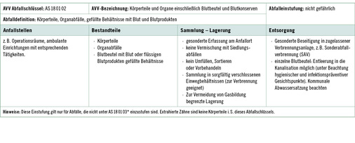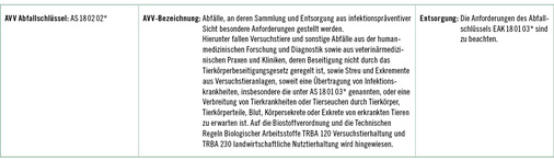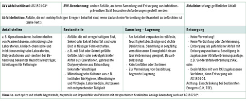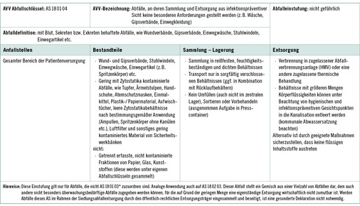 5.6.1 Die Zuordnung der Abfälle zu einzelnen Abfallschlüsseln (AS) entsprechend der Abfallverzeichnisverordnung (AVV) erfolgt aufgrund europäischer Vorgaben. National sind für die Entsorgung von Abfällen die „Vollzugshilfe zur Entsorgung von Abfällen aus Einrichtungen des Gesundheitsdienstes“ der Länderarbeitsgemeinschaft Abfall (LAGA) sowie länderspezifische Regelungen maßgeblich. Dabei sind besondere Anforderungen aus Sicht des Arbeitsschutzes und der Infektionsprävention sowohl für die Beschäftigten der Einrichtung als auch für die der Entsorgungsbetriebe, zu berücksichtigen.