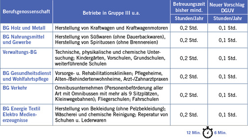Diese weiteren Berufsgruppen sollen auch in die Grundbetreuung mit einbezogen werden. Und: Die Mindestbetreuungs-Einsatzzeit in der Gruppe III will man halbieren – von jährlich zwölf Minuten pro Beschäftigtem auf sechs Minuten. Begründet wird dies mit einem angeblichen Mangel an Betriebsärzten und dem Misstrauen gegenüber ihrem Wirken. Ihre Aufgaben würden die Betriebsärzte in der Grundbetreuung sowieso nicht wahrnehmen und nur Untersuchungen anstellen und abrechnen, heißt es.