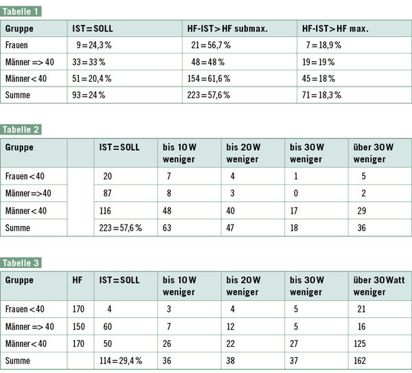 Betrachtet man HF und Soll-Watt isoliert, dann erfüllen bei der HF 23,5 % und bei Soll-Watt 57,6 % die Vorgaben. Senkt man die Soll-Watt-Leistung bis 30 W kommen 128 (33 %) nicht ans Ziel (s. Tabelle 2). Die PWC erreichen 114 (29,4 %); eine bis 30 W reduzierte PWC wird von 162 (41,8 %) nicht erreicht. (s. Tabelle 3)