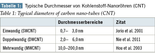 In den 1980er Jahren wurden Durchbrüche in der Kohlenstoff-Chemie erreicht, die zur Synthese neuer Strukturen wie der Fulle-rene (kugelförmige Moleküle aus Kohlenstoff) führten. Anfang der 1990er Jahre wurden Kohlenstoff-Röhrenstrukturen entwickelt, so genannte "carbon nanotubes", CNT (Iijima et al. 1992). Diese Nanoröhren bestehen im Prinzip aus einem System miteinander kondensierter Benzolringe, in denen der Kohlenstoff wie im Benzol nach sp2 hybridisiert ist. Fehlerstellen im Molekül beeinflussen jedoch die Gesamtstruktur. Die Röhrenstrukturen können einwandig („single walled", SWCNT) oder mehrwandig („double-walled“ bzw. „multi-walled", MWCNT), gradlinig oder sphärisch gekräuselt sein ( Tabelle 1 ).