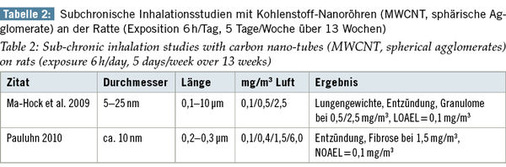Zur Frage von möglichen gesundheitlichen Langzeitauswirkungen von CNT-Expositionen existieren (noch) keine aussagekräftigen arbeitsmedizinischen Studien, da die industrielle Anwendungsdauer hierfür insgesamt zu kurz ist. Die wenigen verfügbaren tierexperimentellen Studien wurden aktuell für SCOEL (Scientific Committee for Occupational Exposure Limits der EU) zusammengestellt; regulatorisch wesentliche Daten, die unter subchronischer Inhalation (3 Monate an der Ratte) gewonnen wurden, sind in Tabelle 2 zusammengefasst.