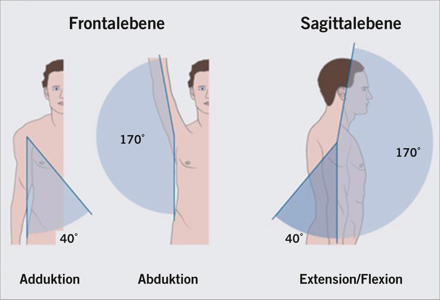 Fig. 1: Range of motion of the shoulder joint in the frontal and sagittal plane in accordance with DVSE 2012