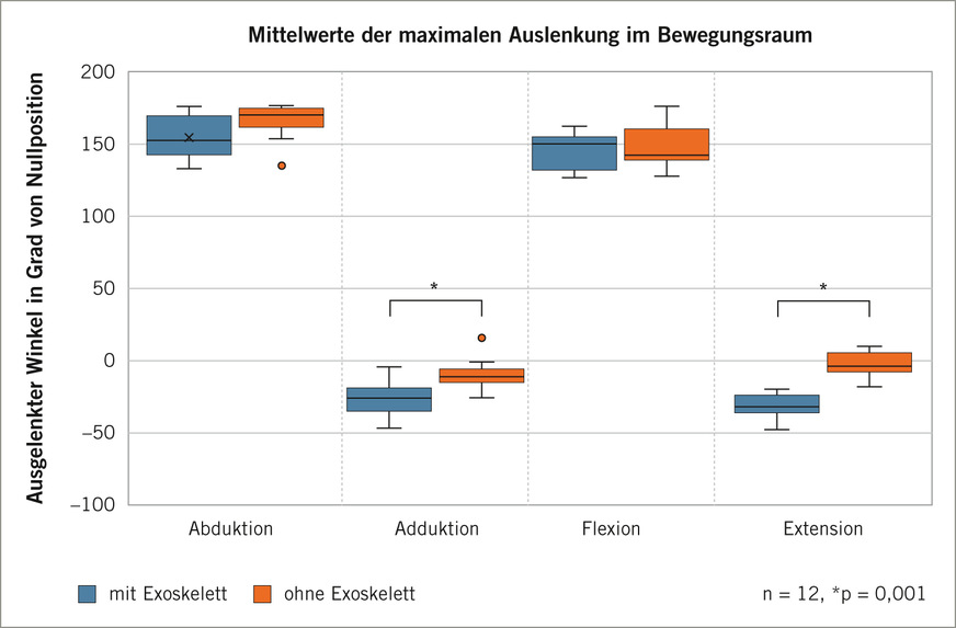 Für jede Testperson wurde der Mittelwert der maximalen Auslenkung aus den Wiederholungen in den Versuchsausprägungen mit und ohne Exoskelett für die Abduktion, Adduktion, Flexion und Extension ermittelt.