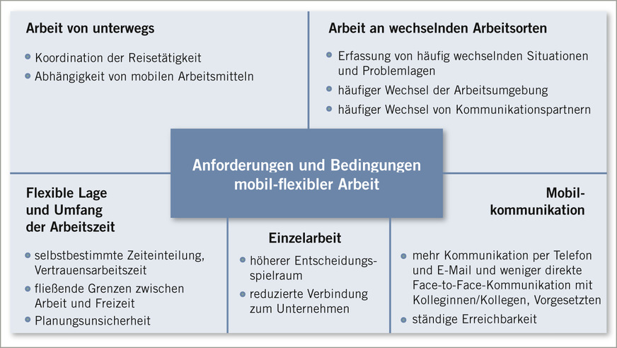 Für die mobil-flexible Arbeit lassen sich fünf Anforderungs- und Bedingungsfelder formulieren, die in ➥ Abb. 2 dargestellt