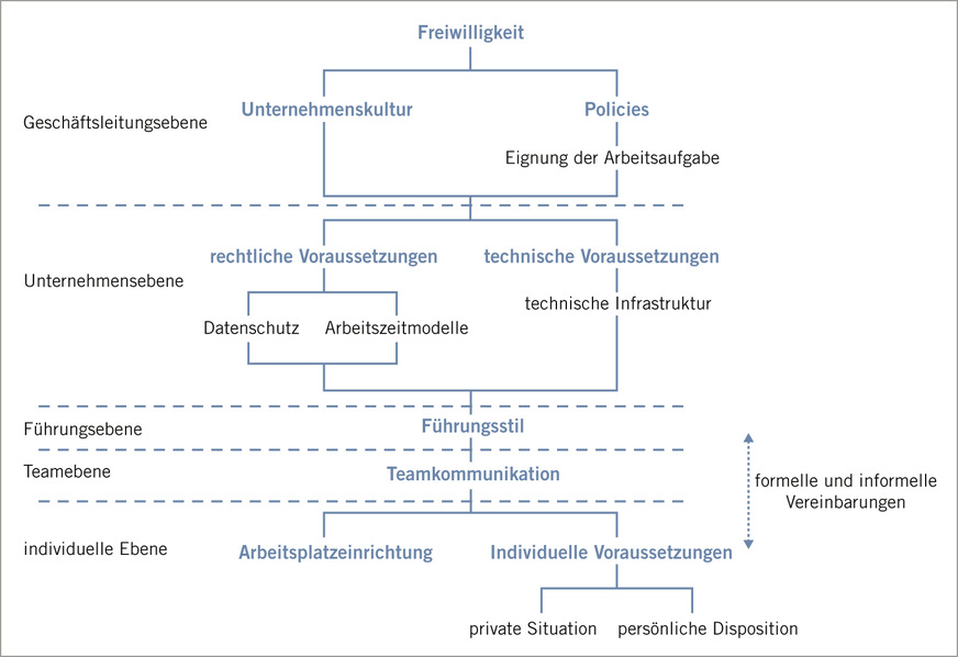 Das Grundkriterium dabei ist die Freiwilligkeit. Beschäftigte sollen die Chance haben, sich selbst für diese Arbeitsform entscheiden zu können (Hupfeld et al. 2013). Die nachfolgenden Kriterien bauen sich von der Geschäftsleitungsebene bis hin zur individuellen Ebene auf. Der Unterschied zwischen der Geschäftsleitungs- zur Unternehmensebene besteht darin, dass zu der Geschäftsleitungsebene die Hauptentscheidungsträger2 der Organisation zählen, die Unternehmensebene hingegen den Verbund von verschiedenen Abteilungen meint.