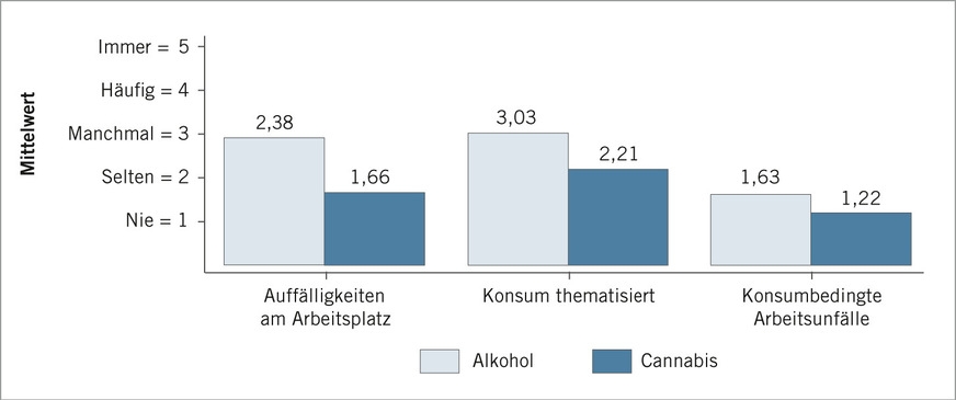 Die Ergebnisse in ➥ Abb. 4 zeigen zudem, dass Alkohol im betrieblichen Kontext deutlich häufiger thematisiert und als problematisch wahrgenommen wird als Cannabis. Sowohl Gespräche in der Sprechstunde als auch Auffälligkeiten am Arbeitsplatz und konsumbezogene Arbeitsunfälle werden deutlich häufiger mit Alkoholkonsum in Verbindung gebracht. Cannabis hingegen spielt bislang eine deutlich geringere Rolle – sowohl in der Wahrnehmung durch Arbeits- und Betriebsmedizinerinnen und -mediziner als auch bei konkreten Vorfällen wie konsumbedingten Auffälligkeiten am Arbeitsplatz oder diesbezüglichen Arbeitsunfällen.