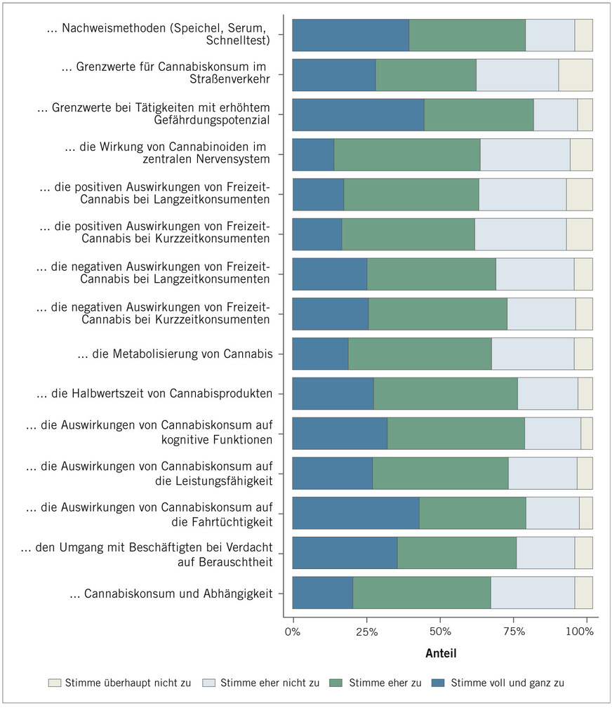Gemäß den in ➥ Abb. 6 dargestellten Rückmeldungen besteht aus Sicht der Befragten dennoch Fortbildungsbedarf („Für die Ausübung meiner betriebsärztlichen Tätigkeit benötige ich mehr Wissen über …“), und zwar, der Bedeutsamkeit nach geordnet, vornehmlich zu den Themen Grenzwerte für Tätigkeiten mit Gefährdungspotenzial, kognitive Auswirkungen von Cannabiskonsum, Halbwertszeit von Cannabisprodukten, Metabolisierung von Cannabis und Wirkung von Cannabinoiden im zentralen Nervensystem.