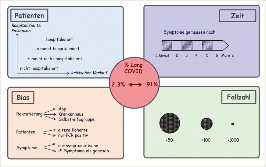 Die Symptome und deren Häufigkeit sind in den dazu publizierten unterschiedlichen Studien nicht unmittelbar vergleichbar. So wird diese durch die untersuchten Patientenpopulationen (Alter, Geschlecht etc.), die Größe der Patientenpopulationen und den Selektionsprozess der Patientinnen und Patienten (z. B. populationsbasiert vs. Symptom-getriggert), die Art des SARS-CoV-2-Nachweises (PCR, Serologie, Anamnese) und die Erfassung der Symptome (selbstberichtet vs. ärztlich diagnostiziert) beeinflusst. Auch führt eine uneinheitliche Definition der Begriffe „Long-COVID“ beziehungsweise „Post-COVID-Syndrom“ beziehungsweise die Vermischung der Patientenpopulationen zu unterschiedlich berichteten Häufigkeiten. Nur einige Punkte, die in den bisher vorliegenden Studien sehr unterschiedlich sind, sind hier illustriert (➥ Abb. 3).