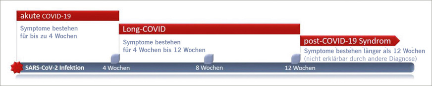 Das SARS-Coronavirus Typ 2 (severe acute respiratory syndrome coronavirus type 2, SARS-CoV-2) ist für die Pandemie mit der Coronavirus-Krankheit 2019 (COVID-19) verantwortlich, die zu globalen Krisen mit hohem Ressourcenverbrauch in Gesundheitssystemen geführt hat. COVID-19 (ICD U07.1) ist heute als Multiorgankrankheit mit einem breiten Spektrum von Manifestationen anerkannt. Ähnlich wie bei anderen Infektionskrankheiten, gibt es nach einer akuten COVID-19-Infektion Patientinnen und Patienten mit anhaltenden Beschwerden (➥ Abb. 1), die ab einer Zeitspanne von vier Wochen nach Infektion als Long-COVID oder postakute Folgen von COVID-19 (post-acute sequelae of COVID-19) (Nalbandian et al. 2021) und bei Persistenz von mehr als zwölf Wochen als Post-
