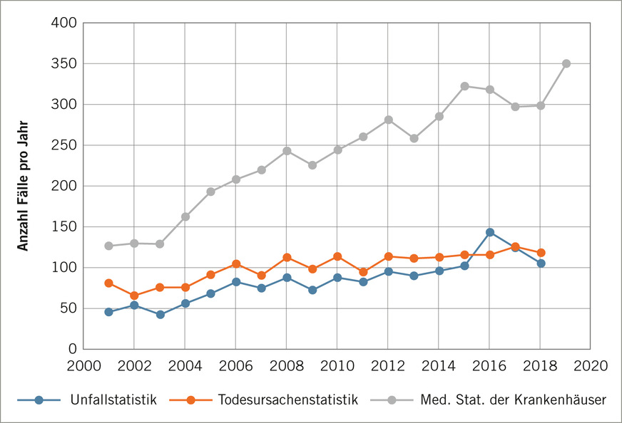 Ergebnisse: Die Analyse aller Datenquellen ergab steigende Fallzahlen für den beobachteten Zeitraum. Die Zahlen aus Unfallstatistik und Todesursachenstatistik nähern sich im Verlauf zunehmend an. Die Fallzahlen der Krebsregister und der Medizinischen Statistik der Krankenhäuser liegen deutlich über denen der anderen beiden Datenquellen.
