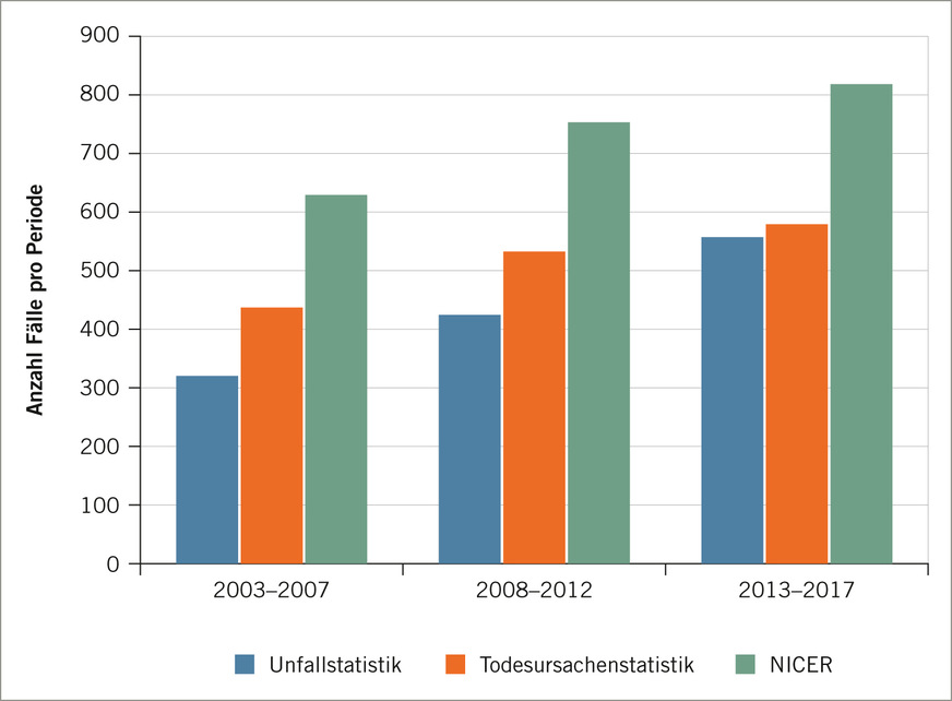 ➥ Abbildung 3 illustriert, dass die Fallzahlen aus Unfallstatistik und Todesursachenstatistik steigen und sich angleichen. Die NICER-Daten zeigen ebenfalls einen steigenden Trend bei jedoch größeren Fallzahlen.