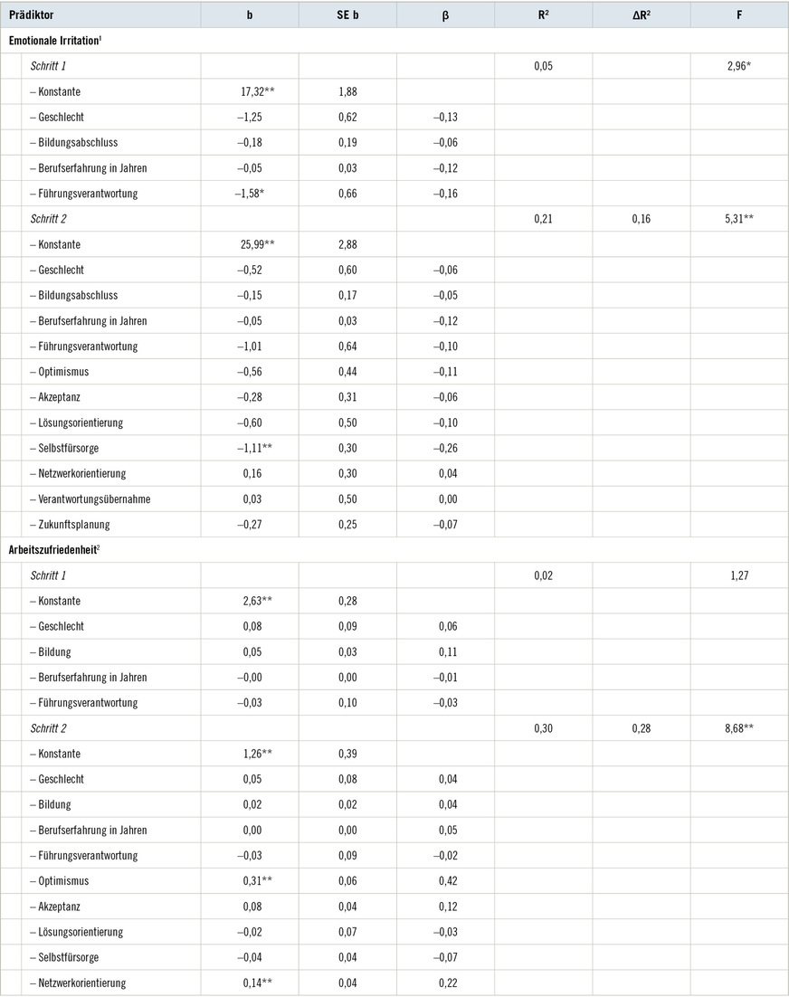 Von den Kontrollvariablen Geschlecht, Bildung, Führungsverantwortung und Berufserfahrung leistete lediglich Führungsverantwortung eine signifikante Varianzaufklärung von 5 %. Mit Aufnahme der Resilienzfacetten erwies sie sich jedoch nicht mehr als relevant. Selbstfürsorge stellte als einzige der sieben Facetten beruflicher Resilienz einen signifikanten Prädiktor der emotionalen Irritation dar und erklärte im zweiten Modellschritt inkrementell 16 % der Varianz. Je höher die Selbstfürsorge war, desto geringer war die emotionale Irritation.
