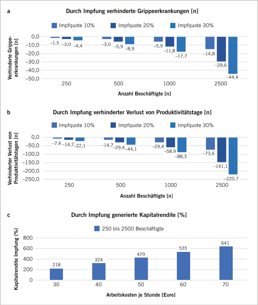 ➥ Abbildung 3 (siehe folgende Seite) verdeutlicht, dass durch die Grippeschutzimpfung am Arbeitsplatz eine signifikante Anzahl von Grippeerkrankungen vermieden werden kann. Dies führt zu einer Reduktion der verlorenen Produktivtage und ermöglicht damit erhebliche Kosteneinsparungen aus Unternehmenssicht. Bei einer durch ein strukturiertes Impfprogramm als erreichbar angenommenen Impfquote von 30 % können über 770.000 Erkrankungsfälle verhindert, mehr als 3,8 Millionen Produktivtage gerettet und Kosten von über 1,07 Milliarden Euro für die Unternehmen vermieden werden (absolute Werte). Die Kapitalrendite in einem deutschlandweiten Szenario beträgt 321 %, und zwar unabhängig von der Impfquote (in der Abwesenheit von Fixkosten), da diese Zähler und Nenner gleichermaßen beeinflusst und die Kapitalrendite als Verhältniszahl somit konstant sein lässt.