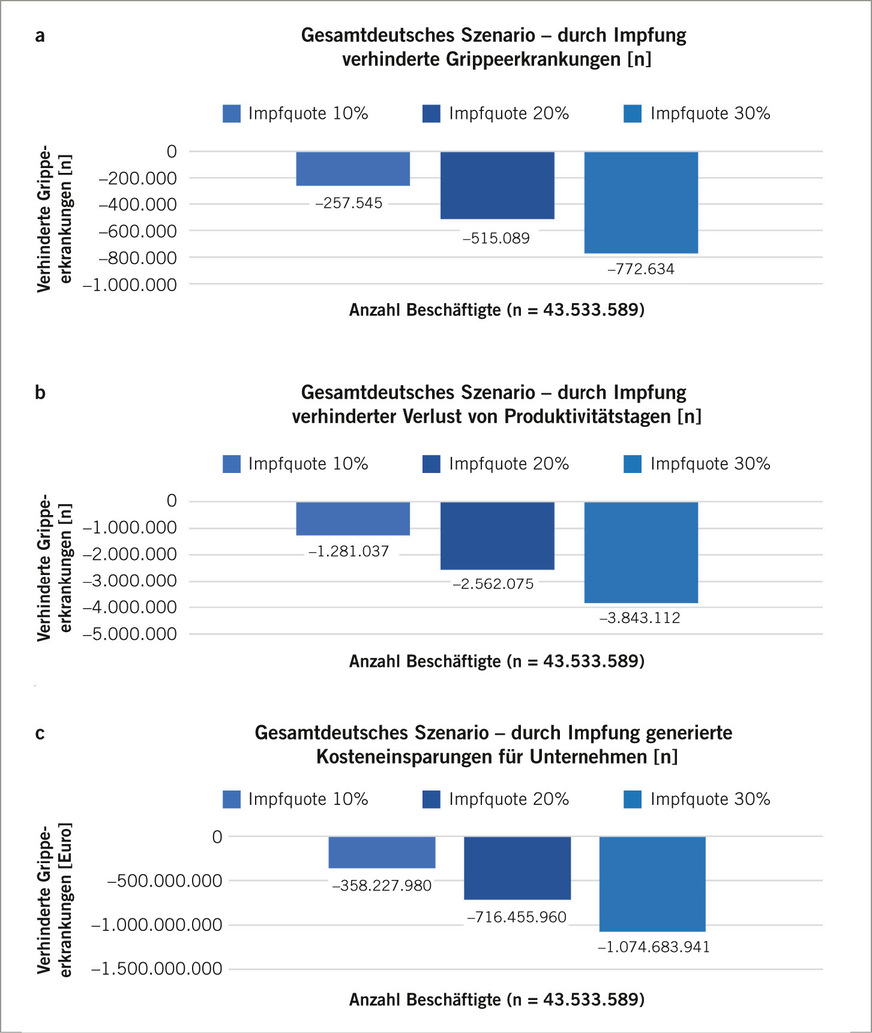 Das bundesweite Szenario zeigt die Auswirkungen von Grippeschutzimpfungen am Arbeitsplatz aus (gesamt-)volkswirtschaftlicher Perspektive. Die Ergebnisse, die die Gesamtheit der Erwerbstätigen in Deutschland abbilden, sind in Abb. 3 dargestellt.