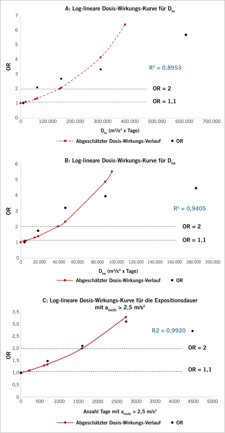 Aus den ermittelten Dosis-Wirkungs-Beziehungen wurden für verschiedene Dosiswerte (Dhv, Dhw und Expositionsdauer mit ahw(8) > 2,5 m/s2) glatte Dosis-Wirkungs-Kurven abgeleitet. Entsprechend der exponentiellen Funktion des logistischen Regressionsmodells wurde angenommen, dass die Dosis-Wirkungs-Beziehungen der fünf Expositionskategorien log-lineare Verläufe darstellen (s. Tabelle 3). Zur Quantifizierung der statistischen Parameter dieser Verläufe wurden die Medianwerte jeder Expositionskategorie verwendet, wobei die letzte Expositionskategorie in den Berechnungen nicht berücksichtigt wurde. Die Wertebereiche der letzten Expositionskategorie waren zu groß und stellten in der Regel einen Ausreißer dar. Die abgeleiteten Dosis-Wirkungs-Kurven für die verschiedenen Dosismodelle sind in ➥ Abb. 2 dargestellt. Die Varianzerklärung der abgeschätzten log-linearen Korrelation zwischen der Expositionsdosis und OR betrug R2 = 0,8953, 0,9405 und 0,9920 jeweils für Dhv, Dhw und die Expositionsdauer mit ahw(8) > 2,5 m/s2.