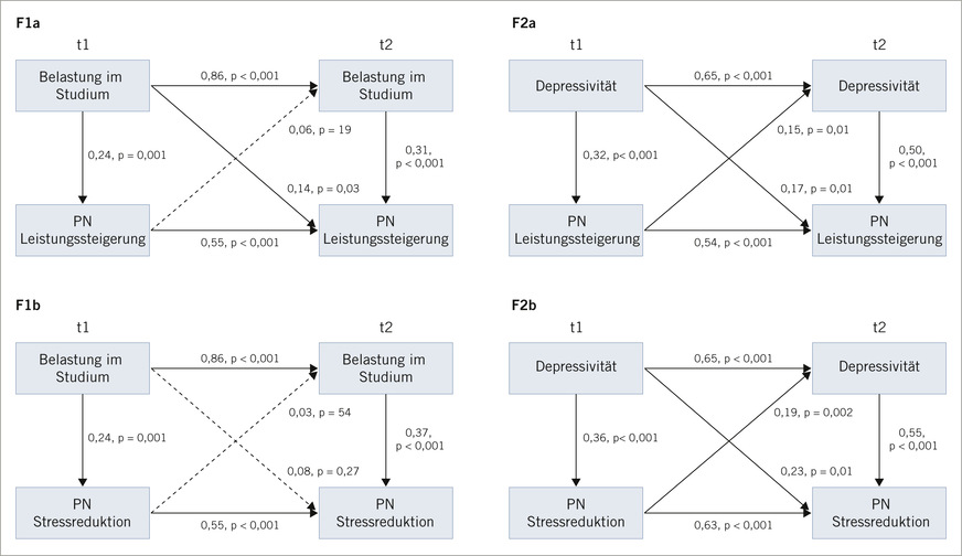 Effekt von leistungssteigernder PN auf die Belastung. Bezogen auf die Zusammenhänge zwischen Belastung im Studium und stressreduzierender PN zeigen sich keine signifikanten Cross-Lagged-Pfade (➥ Abb. 3). Es lässt sich für die Forschungsfrage 1a eine Kausalität finden, jedoch nicht für die Forschungsfrage 1b.