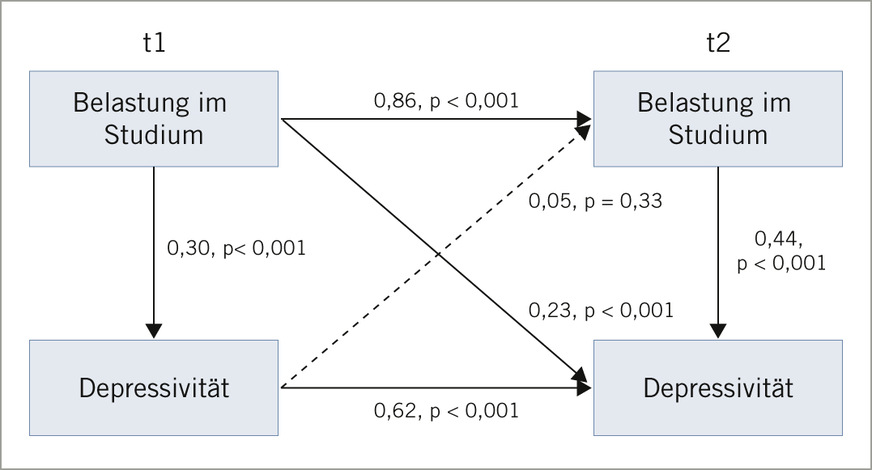 Zuerst werden in einer Hypothese die kausalen Zusammenhänge zwischen Belastung im Studium und Depressivität untersucht. Die querschnittlichen Zusammenhänge zwischen Belastung im Studium und Depressivität waren zu beiden Messzeitpunkten signifikant (➥ Abb. 2). Bei den Regressionen über die Zeit zeigt sich, dass die Belastungen im Studium zu t1 ein signifikanter positiver Prädiktor für Depressivität zu t2 ist, aber Depressivität zu t1 keine Vorhersagekraft für Belastungen im Studium zu t2 besitzt (s. Abb. 2).