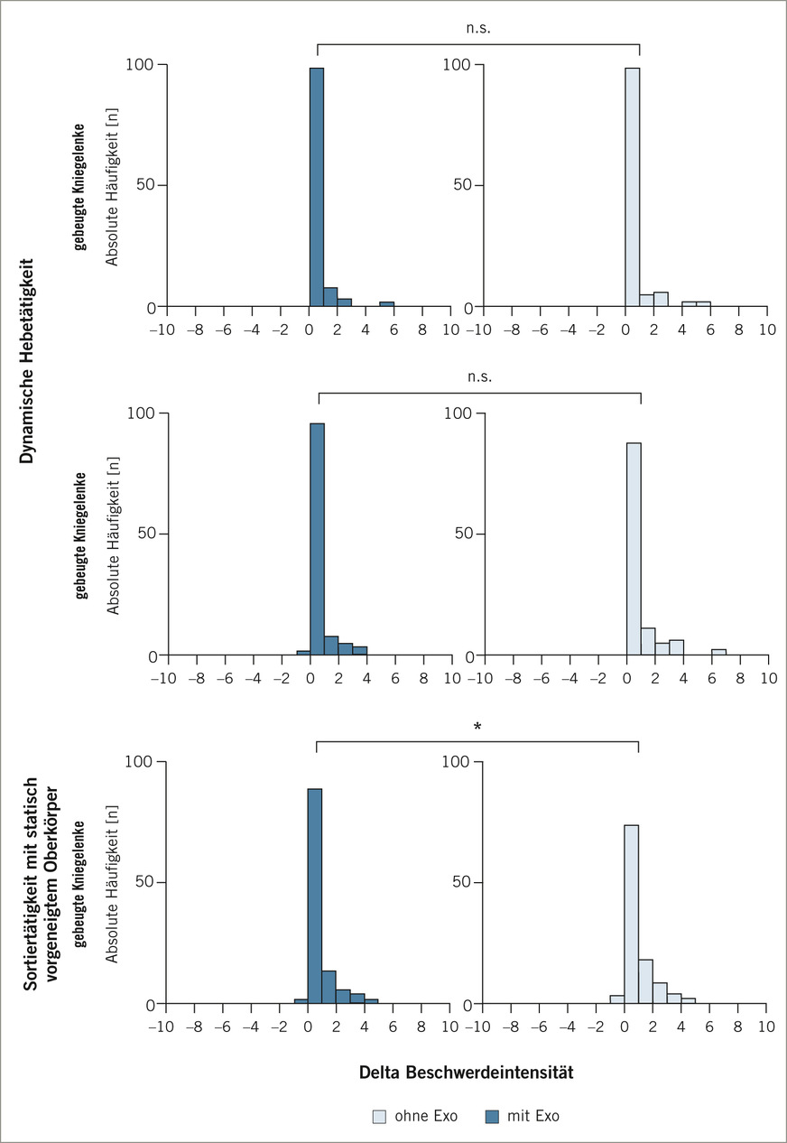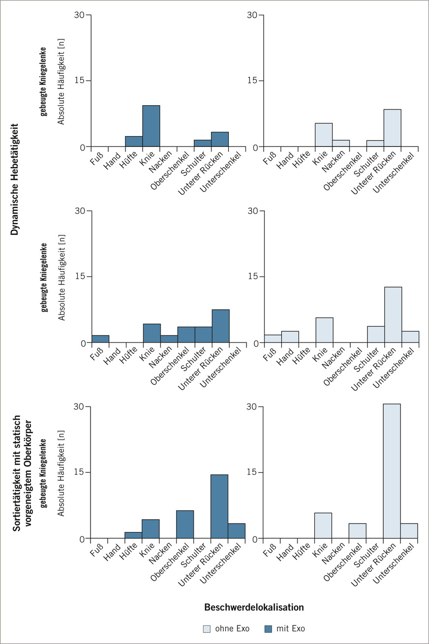 Ergebnisse: Mit Exoskelett kam es stets zu einer geringen Reduktion der empfundenen körperlichen Beanspruchung (p < 0,05). Beschwerden traten selten auf, waren gering und meistens im unteren Rücken. Bei der Sortiertätigkeit in statischer Oberkörpervorneigung mit Exoskelett war die Beschwerdeintensität im Median um einen Punkt niedriger als ohne Exoskelett (p < 0,05). Auch die Beschwerdehäufigkeit war dabei durch Verwendung des Exoskeletts geringer. Beim dynamischen Heben ergaben sich keine Unterschiede in der Beschwerdeintensität. Beim Heben mit gestreckten Kniegelenken war die Beschwerdehäufigkeit mit Exoskelett leicht reduziert, mit gebeugten Kniegelenken nicht.