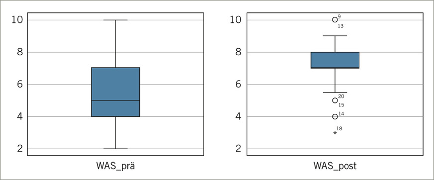 Bezüglich des WAS zeigte sich ein stringentes Bild einer Verbesserung der derzeitigen Arbeitsfähigkeit im Vergleich zu der besten, je erreichten Arbeitsfähigkeit. In Summe konnte eine Steigerung des WAS von 5,57 auf 7,05 Punkte nachgewiesen werden, was einer Steigerung von 26,57 % gleichkommt (➥ Abb. 2). Eine genauere Betrachtung zeigte zudem eine Verbesserung des WAS bei 14 von 21 Testpersonen. Drei Personen wiesen im Eingangs- und Ausgangstest die gleichen WAS-Werte auf, bei vier Teilnehmenden stellte sich eine Verschlechterung ein (siehe Abb. 6). Zusammengefasst konnte durch die Intervention eine positive und statistisch signifikante Veränderung (p <0,001) der derzeitigen Arbeitsfähigkeit herbeigeführt werden.