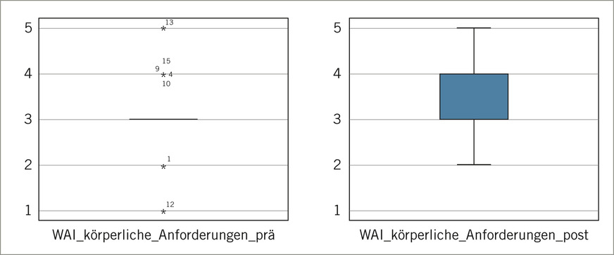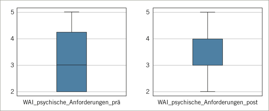 Die ebenfalls in einer Einzelbetrachtung getesteten Parameter der körperlichen und psychischen Arbeitsfähigkeit in Bezug auf die Arbeitsanforderungen (zweite Dimension des WAI) zeigten ebenfalls eine positive Beeinflussung durch die Intervention.