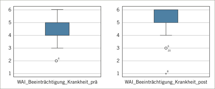 Der untersuchte Parameter der geschätzten Beeinträchtigung durch eine Krankheit (siebte Dimension des WAI) zeigte die gleiche positive Tendenz wie die beiden bereits diskutierten Parameter. Die trotz eines extremen Ausreißers (Testperson 8, siehe Abb. 5 und 6) signifikante positive Beeinflussung lässt eine auf die durchgeführten Maßnahmen zurückführbare Veränderung vermuten. Es ist also zu erkennen, dass der auf die Bedürfnisse der getesteten Personen angepasste verhaltens- und verhältnispräventive Ansatz die globale Beeinträchtigung durch eine Erkrankung reduzieren konnte. Dies steht wiederum im Einklang mit den Ergebnissen von Boschmann et al. (2017). Diese konnten reduzierte krankheitsrelevante Symptome durch die Kombination von verhaltens- und verhältnispräventiven Maßnahmen nachweisen. Vor allen die eingangs beschriebenen, mit zunehmendem Arbeitsalter (Employee Life Cycle) ansteigenden und in ihrer Relevanz auf AU-Tage zunehmenden muskuloskelettalen Erkrankungen, können dabei durch arbeitsplatzbezogene Maßnahmen positiv beeinflusst werden. Wiederum ähnlich der beiden vorhergehend diskutierten Parameter kann davon ausgegangen werden, dass der Effekt umso höher ausfällt, desto stärker eine Krankheit bereits zu einer Beeinträchtigung der Arbeitsfähigkeit geführt hat.