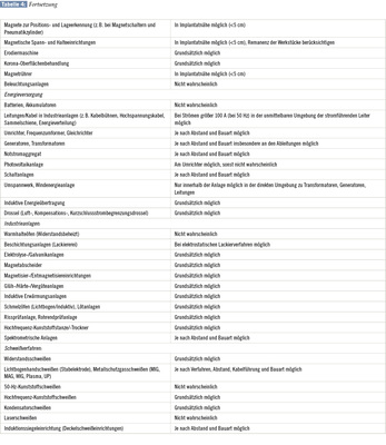 Elektromagnetische Felder des Alltagslebens können in unterschiedlicher Weise mit kardialen implantierbaren elektrischen Geräten interagieren. Das Auftreten einer Interferenz sowie die Auswirkungen auf das implantierte System hängen dabei im Wesentlichen von Stärke und Frequenz des elektromagnetischen Feldes ab und haben in Abhängigkeit von der Expositionsdauer bei unterschiedlichen Grunderkrankungen und Implantaten verschiedene klinische Relevanz [69].