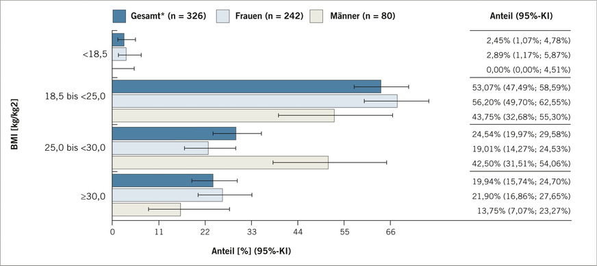Untergewicht basierend auf einem BMI von < 18,5 kg/m2 lag bei 2,89 % (95%-KI: 1,17 %; 5,87 %) der teilnehmenden Ärztinnen vor (➥ Abb. 2). Normalgewicht (BMI 18,5 bis < 25,0 kg/m2) zeigten 53,07 % (95%-KI: 47,49 %; 58,59 %) der Studienteilnehmenden, wobei der Anteil der Frauen mit Normalgewicht höher war als der Anteil der Männer. Obwohl Männer (42,50 % [95%-KI: 31,51 %; 54,06 %]) häufiger Übergewicht (BMI 25,0 bis < 30,0 kg/m2) aufwiesen als Frauen (19,01 % [95%-KI: 14,27 %; 24,53 %]), waren mehr Frauen (21,90 % [95%-KI: 16,86 %; 27,65 %]) als Männer (13,75 % [95% KI: 7,07 %; 23,27 %]) adipös (BMI ≥ 30 kg/m2).
