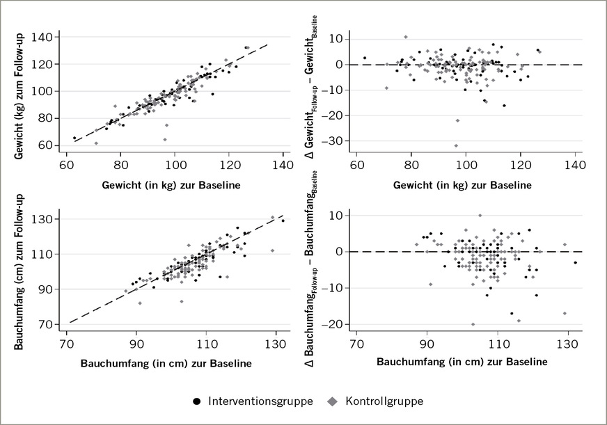 Die Streudiagramme in ➥ Abb. 2 visualisieren die Veränderungen von Gewicht und Bauchumfang bei Teilnehmenden, die sowohl eine Messung zur Baseline- als auch zur Follow-up-Untersuchung nach 12 Monaten erhielten. Die Veränderung des Gewichts reichte von –16,1 bis +8 kg in der Interventions- und von –31,1 bis +11 kg in der Kontrollgruppe (s. Abb. 2, oberer Teil). Von denjenigen, die zu beiden Zeitpunkten an der Studie teilnahmen, reduzierten jeweils 44,4 % in der Interventions- und 51,6 % in der Kontrollgruppe ihr Gewicht gegenüber respektive 47,2 % und 41,9 %, die an Gewicht zunahmen (bei jeweils 8,3 % und 6,5 % mit unverändertem Gewicht).