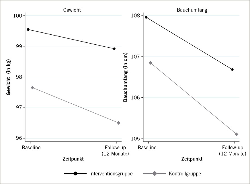 für eine deskriptive Beschreibung der Studienteilnehmenden verwendet. Als Signifikanztests bei kontinuierlichen Variablen wurden der t-Test für unabhängige Stichproben oder der Wilcoxon-Rangsummentest verwendet sowie Pearson’s Chi²-Test oder der exakte Test nach Fisher bei kategorialen Variablen. Lineare gemischte Modelle wurden verwendet, um die Mittelwertdifferenz zwischen Baseline und Follow-up nach 12 Monaten bezüglich Gewicht und Bauchumfang zwischen der Interventions- und der Kontrollgruppe zu schätzen. Dabei wurden die kategoriale Gruppenvariable (Intervention/Kontrolle), der Zeitpunkt (Baseline/Follow-up nach 12 Monaten), ein Gruppen-Zeit-Interaktionseffekt sowie ein teilnahmespezifischer „random intercept“ als fixe Effekte in das Modell aufgenommen. In dieser Analyse wurden zunächst alle Teilnehmenden berücksichtigt, unabhängig jeglicher Nutzung der Webseite oder Dropout. In Sensitivitätsanalysen wurde die Interventionsgruppe auf diejenigen Personen beschränkt, die sich zumindest einmal auf der Webseite eingeloggt hatten. In einer weiteren Sensitivitätsanalyse wurde ein Ausreißer in der Kontrollgruppe ausgeschlossen, der zwischen Baseline und Follow-up-Untersuchung sein Gewicht um mehr als 30 kg verringerte.