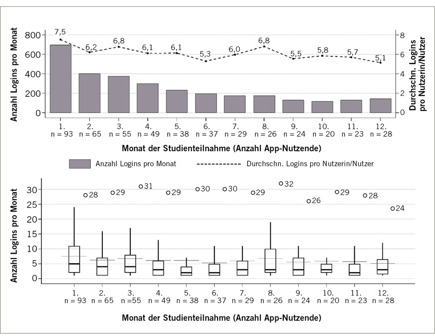 Drei Viertel aller Teilnehmenden in der Interventionsgruppe (105/140) haben sich auf der Webseite mindestens einmal eingeloggt, wobei über den gesamten Beobachtungszeitraum 3078 Logins erfolgten, was, bei denjenigen, die die App nutzten, im Durchschnitt 29,3 Logins pro Person entspricht (Median: 14; IQR: 3,5–27). Von den Nutzenden der Webseite loggten sich 16,2 % (n = 17) lediglich einmalig ein, 25,7 % (n = 27) 2- bis 9-mal, 19,1 % (n = 20) 10- bis 19-mal, 25,7 % (n = 27) 20- bis 49-mal, 6,7 % (n = 7) 50- bis 99-mal und 6,7 % (n = 7) 100-mal oder häufiger. Im ersten Monat der Studienteilnahme war sowohl die Anzahl der Logins (n = 699) als auch die Anzahl der eingeloggten Personen (n = 93) mit Abstand am höchsten und sank danach, mit Ausnahme der beiden Monate vor Studienende, relativ kontinuierlich ab (➥ Abb. 4, oberer Teil). Die maximale Anzahl an Logins pro Monat und Nutzenden lag über die gesamte Beobachtungszeit zwischen 24 und 32 (s. Abb. 4, unterer Teil).