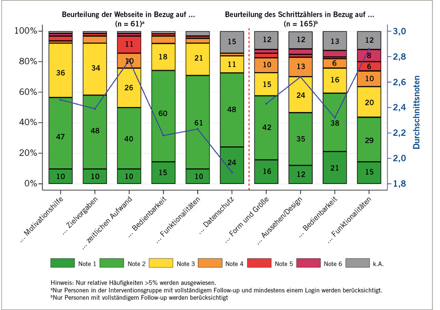 Im Hinblick auf die Nutzung des Schrittzählers gab etwas mehr als die Hälfte (53,9 %) der 165 Studienteilnehmenden mit vollständigem Follow-up an, den Schrittzähler in den letzten 4 Wochen gar nicht genutzt zu haben, gegenüber jeweils 15,2 %, 17,6 % und 7,3 %, die den Schrittzähler täglich, wöchentlich oder monatlich nutzten (bei 6,1 % fehlenden Angaben). Mehr als die Hälfte (57,6 %) hatte vor der Studienteilnahme bereits einen Schrittzähler verwendet. Von denjenigen, die den Schrittzähler selten oder gar nicht verwendeten (n = 101), gaben 48,5 % als Grund (Mehrfachangaben möglich) die Nutzung eines anderen Schrittzählers an, 25,7 % eine fehlende Möglichkeit der Verwendung (z. B. berufliche Gründe), 17,8 % eine fehlende Motivation und 5,9 % gaben an, dass ihnen der Schrittzähler nicht gefallen hatte. Beim Schrittzähler wurde die Bedienbarkeit am besten (Durchschnittsnote: 2,3) und die Funktionalitäten am vergleichsweise schlechtesten (Durchschnittsnote: 2,9) bewertet (s. Abb. 5, rechte Seite).
