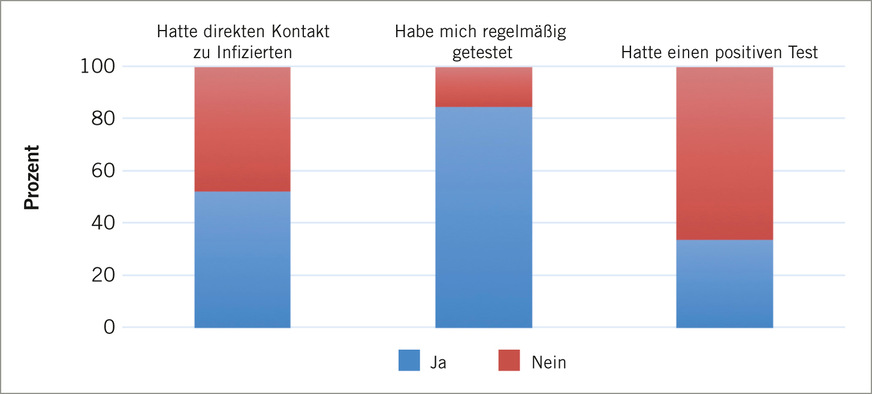 Anhand der anamnestischen Angaben ergab sich eine SARS-CoV-2-Prävalenz von 33,8 %. Allerdings gaben zwei Personen an, dass der nachfolgende RT-PCR-Bestätigungstest negativ gewesen sei, so dass die korrigierte Prävalenz 29,57 % beträgt.