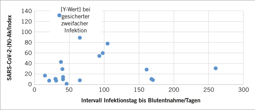 Insgesamt scheinen die ermittelten, relativen anti-Nucleocapsidprotein-Antikörperkonzentrationen mit zunehmender Zeitspanne zwischen zurückliegender Infektion und Probennahme abzunehmen (➥ Abb. 3).