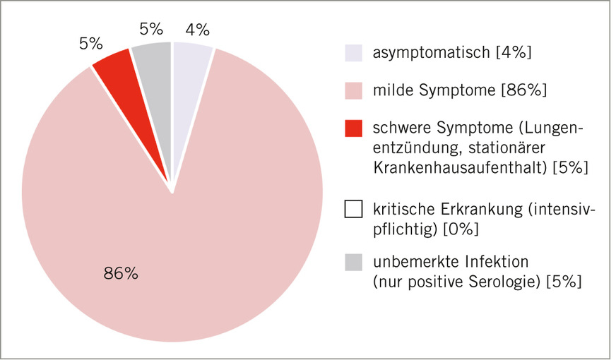 In Hinblick auf die Krankheitsschwere von COVID-19 gaben die Studienteilnehmenden überwiegend milde Symptome an (86 %; ➥ Abb. 4). Kritische Erkrankungen traten nicht auf.