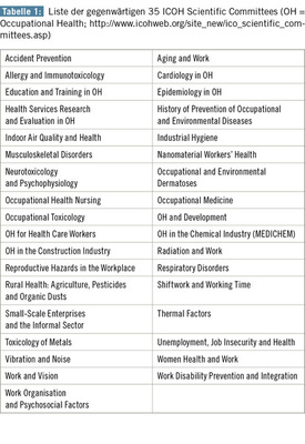 Zurzeit decken 35 Scientific Committees (SC) spezifische arbeitsmedizinische Themenfelder ab. Das Themenspektrum reicht von klassischen fokussierten Fragen wie „Musculoskeletal Disorders“ oder „Radiation and Work“, über breitere Themenfelder wie „Work Organisation and Psychosocial Factors“ bis hin zu Fragen von Organisation und Methodik der Arbeitsmedizin wie z. B. im Komitee „Health Services Research and Evaluation in OH” und auch „Education and Training in OH“ ( Tabelle 1 ). Jedes Komitee ist angehalten, zwischen den dreijährigen Weltkongressen eigene Konferenzen zu veranstalten.