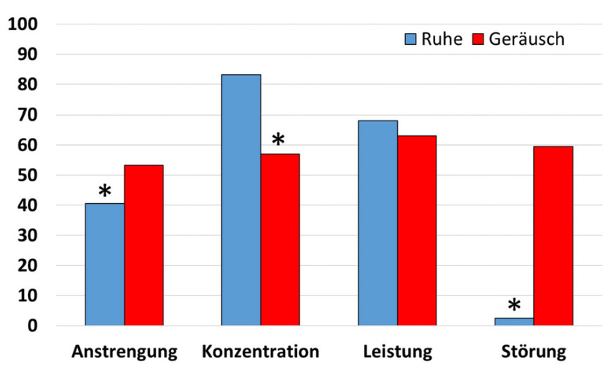 Ergebnisse: In der Gesamtgruppe hat sich ein tendenzieller Effekt mit einer geringeren Anzahl richtig bearbeiteter Items in der Geräuschbedingung im Vergleich zur Ruhebedingung gezeigt. In den einzelnen Geräuschgruppen fielen die Ergebnisse unterschiedlich aus. Die subjektiven Einschätzungen ergaben in der Geräuschbedingung größere erlebte Anstrengung und Störung sowie geringere selbst eingeschätzte Konzentration als in der Ruhebedingung.
