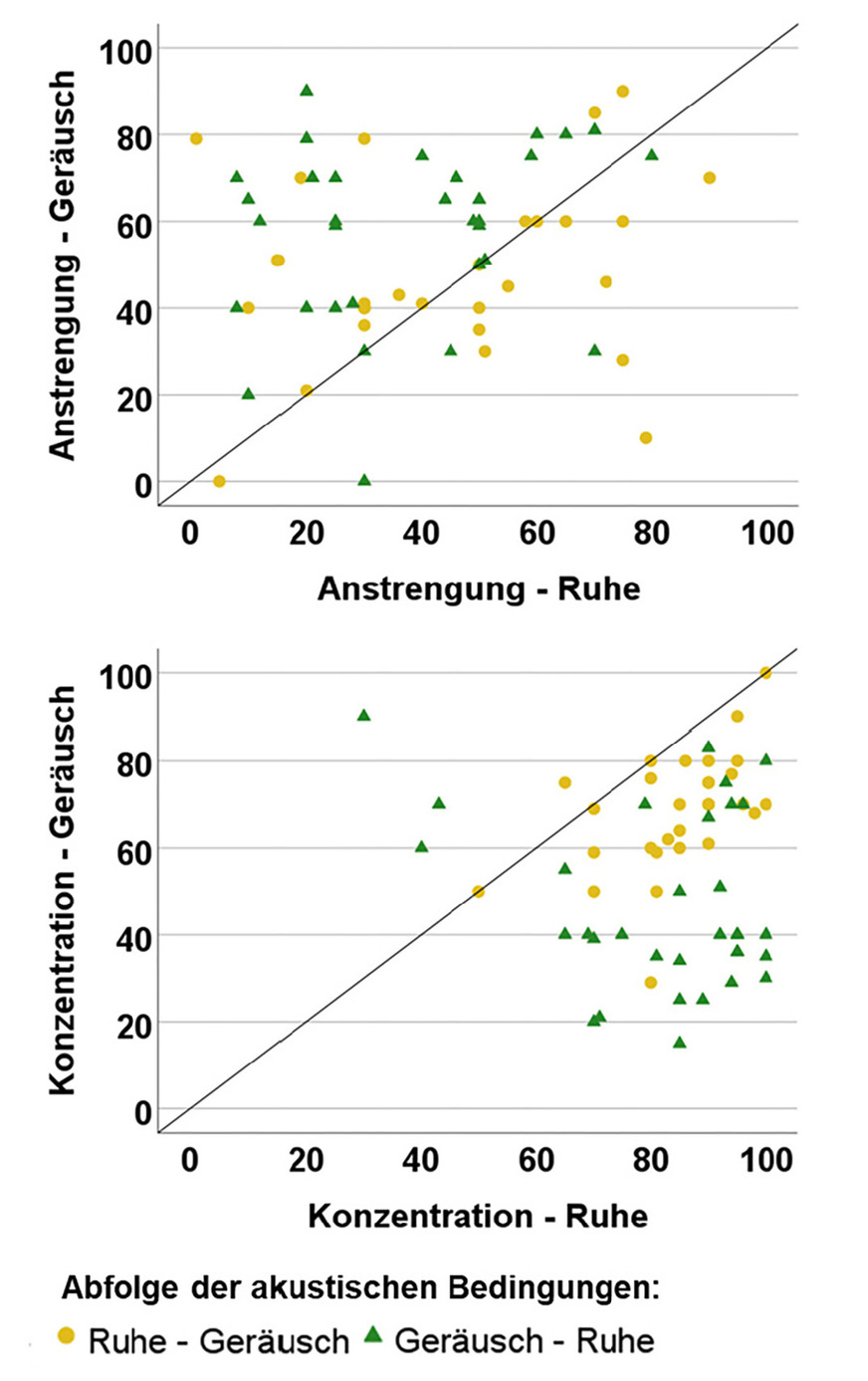 Fig. 4: Interrelation between the subjective assessment in the silent condition and in the sound condition for the aspects “experienced effort” (top) and “self-assessed concentration” (bottom)