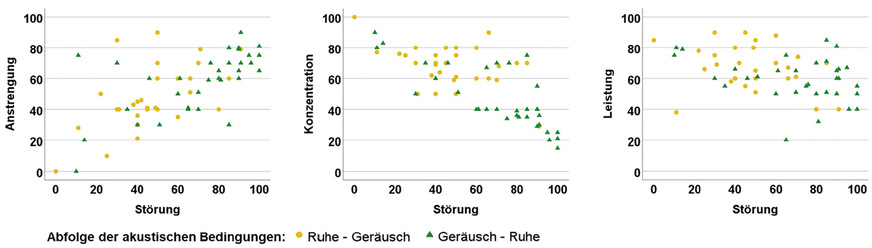 Die für die Geräuschbedingungen ermittelten deutlichen Zusammenhänge zwischen der erlebten Störung und den anderen subjektiven Einschätzungen legen nahe, dass die Frage nach der „erlebten Störung“ von zentraler Bedeutung ist. Eine starke erlebte Störung steht im Zusammenhang mit hoher erlebter Anstrengung, geringer selbst eingeschätzter Konzentration und geringer selbst eingeschätzter Leistung, also mit der jeweils negativen Ausprägung der anderen Aspekte. Auch wenn hier keine Aussage über eine Verursachungskette möglich ist, so scheint dieses Ergebnis zu unterstreichen, dass es im Arbeitskontext an erster Stelle wichtig ist, die Störung zu reduzieren, und zwar auf den in den Technischen Regeln vorgegebenen Wegen, beginnend mit der Reduktion der Geräuschbelastung an der Quelle (ASR A3.7).