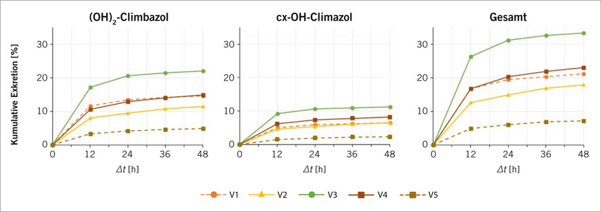 Die Auftragung der kumulierten ausgeschiedenen Menge Climbazol gegen die Zeit nach Dosierung (➥ Abb. 2) zeigt, dass innerhalb der ersten 24 Stunden im Durchschnitt 14,1 % der Dosis als (OH)2-Climbazol und 7,3 % als cx-OH-Climbazol ausgeschieden wurden. Die Exkretion am nächsten Tag hingegen war mit 1,7 % für (OH)2-Climbazol und 0,8 % als cx-OH-Climbazol schon deutlich geringer. Unter Berücksichtigung der ersten beiden Tage konnte angenommen werden, dass die Exkretion an den Folgetagen vernachlässigbar sein würde und ein 48-Stunden-FUE somit angemessen war. Aus dem prozentualen Anteil der beiden Metaboliten ergab sich dass nach 48 Stunden im Durchschnitt 23,9 % der oral verabreichten Climbazol-Dosis als einer der beiden Metabolite ausgeschieden wurde. Da bei V5 eine Beeinflussung des Stoffwechsels durch Johanniskraut wahrscheinlich erschien, wurde V5 in der Berechnung des durchschnittlichen Ausscheidungsfaktors nicht berücksichtigt.