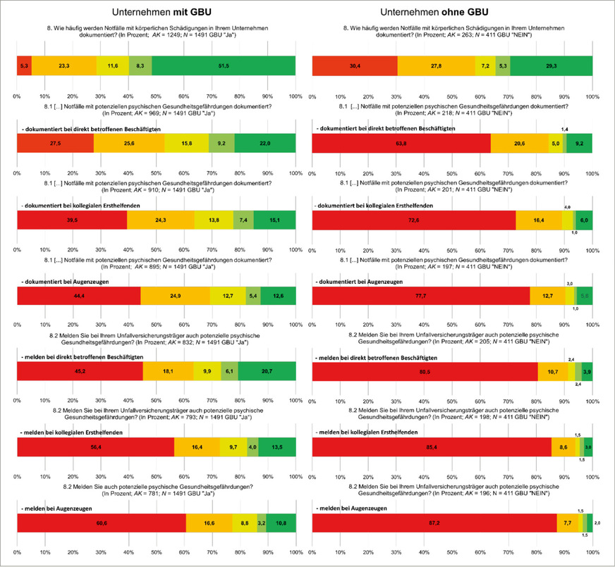 Detail: Bemerkenswert sind die Ergebnisse zur Dokumentation beziehungsweise Meldehäufigkeit in der Gegenüberstellung der Unternehmen mit und ohne Gefährdungsbeurteilung (GBU), wie in ➥ Abb. 2 dargestellt. Hier zeigen sich die gleichen Trends, aber mit einer deutlichen absoluten Verschiebung der Werte. Das bedeutet auch, dass das grundsätzliche Dokumentations- beziehungsweise Meldeverhalten in Unternehmen ohne GBU deutlich geringer ist und psychische Gesundheitsgefährdungen bei betroffenen Beschäftigten nahezu nicht dokumentiert oder gemeldet werden.