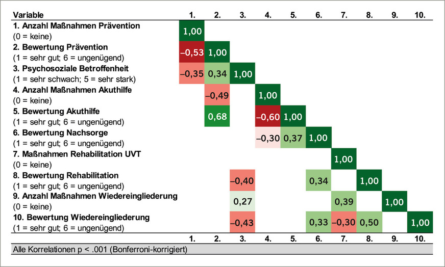 Wiedereingliederung: Wiedereingliederungsmaßnahmen wurden vor allem von älteren Beschäftigten genannt. Männer berichteten häufiger über strukturierte Maßnahmen wie angepasste Arbeitszeiten oder Weiterbildungen. Frauen kritisierten das Fehlen von Unterstützung und fühlten sich bei der Rückkehr an den Arbeitsplatz oft alleingelassen. Mitarbeitende unter 30 Jahren erhielten seltener Wiedereingliederungsangebote und wünschten sich mehr Unterstützung beim Übergang zurück in den Beruf. Die Wiedereingliederung wurde mit einer durchschnittlichen Schulnote von M = 4,29 bewertet. Die Korrelationsmatrix zeigt, dass eine positivere Bewertung der Wiedereingliederung mit einer besseren Rehabilitation sowie einem besseren allgemeinen Befinden einhergeht (vgl. Abb. 4).
