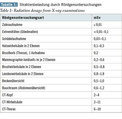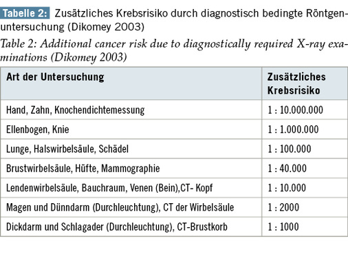 Neben der natürlichen bzw. der beruflich verursachten radioaktiven Strahlenbelastung sind wir zusätzlich aus diagnostischen Gründen einer Röntgenstrahlung ausgesetzt. Das zusätzliche Krebsrisiko bei einer einmaligen Röntgenuntersuchung in Abhängigkeit der Untersuchungsart kann Tabelle 1 entnommen werden. Gemäß Bericht des Umweltministeriums beträgt die mittlere effektive Dosis durch Röntgen- und CT-Untersuchungen in Deutschland 2008 ca. 1,8 mSv (BMU 2008). Somit entspricht das mittlere Krebsrisiko der Bundesbürger durch Röntgenuntersuchungen in etwa dem natürlichen Strahlenrisiko. Tabelle 1 gibt die Strahlendosis unterschiedlicher diagnostischer Röntgenuntersuchungen an, in Tabelle 2 sind die zusätzlichen Krebsrisiken aufgelistet (IRCP, Bundesamt für Strahlenschutz 2009).