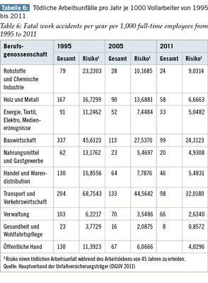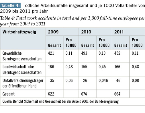 Die Anzahl der meldepflichtigen Unfälle sagt nichts über deren Schwere aus; neben Unfällen mit reversiblen Verletzungen sind auch schwerwiegende Verletzungen mit bleibenden Körperschäden als auch die tödlichen Arbeitsunfälle enthalten. Tabelle 4 listet die tödlichen Arbeitsunfälle von 2009 bis 2011 auf.
