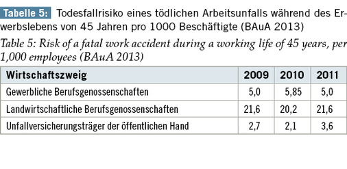 Legt man als mittlere Arbeitszeit 45 Jahre zugrunde, resultieren hieraus folgende arbeitsbedingte Todesfallrisiken in 2011 in der Bundesrepublik Deutschland: